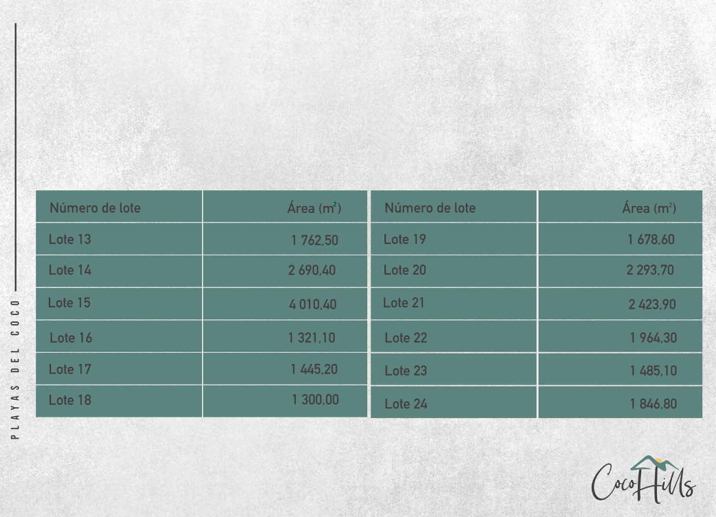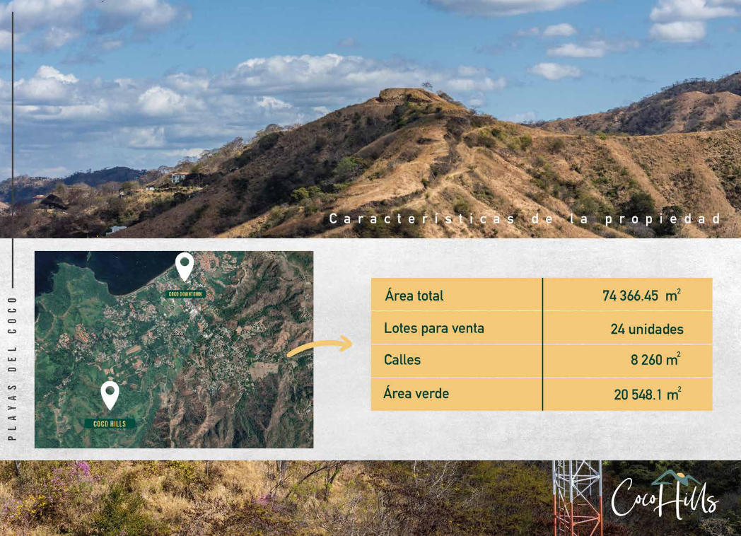Coco Hills is a premium residential project located in the heart of Playas del Coco, one of Costa Rica’s most attractive and renowned destinations. This development spans a total area of 46,577 m², divided into 24 lots designed for the construction of family residences—ideal for enjoying vacations by the sea, a dream retirement, or a fulfilling life surrounded by nature and tranquility.